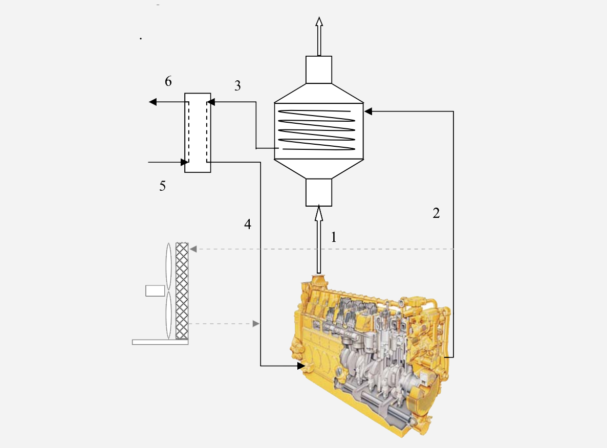 Using a Condex, Condensing Economizer, The hot engine cooling fluid(2) will be further heated by the engine exhaust gas(1). The hot liquid will then go to a dual wall plate and frame heat exchanger(3) where it will give up heat to incoming city water(5) which is then supplied to the adjacent High School(6) for cooking, showers and other domestic uses.